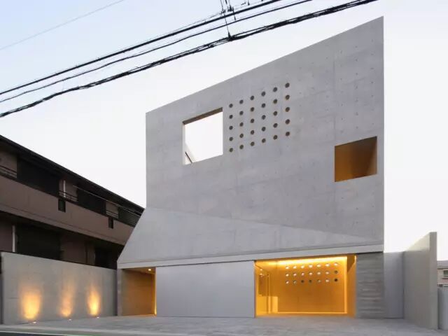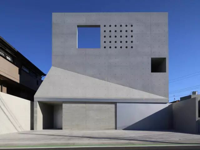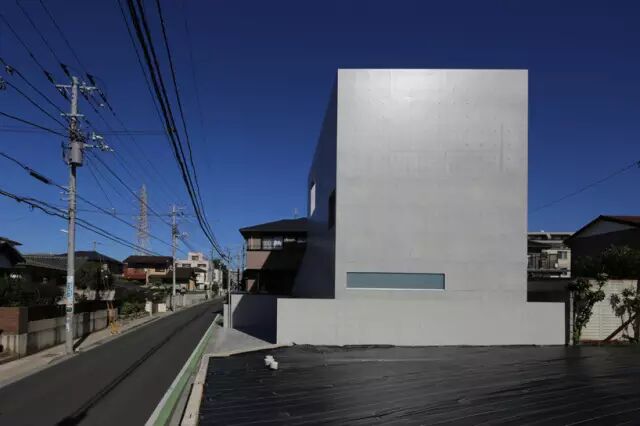 在日本习志野市, fuse-atelier 建筑事务所为一对新婚夫妇设计并完成了一栋三层的混凝土住宅。这栋被称作“津田沼住宅”的建筑位于一条繁忙的公路旁边,并处于住宅区开发用地的边缘,因此住宅从道路边缘向后收进。建筑的形式受到分区的限制,导致建筑外部第二和第三层之间的锥形形变。