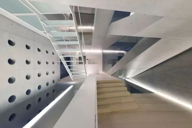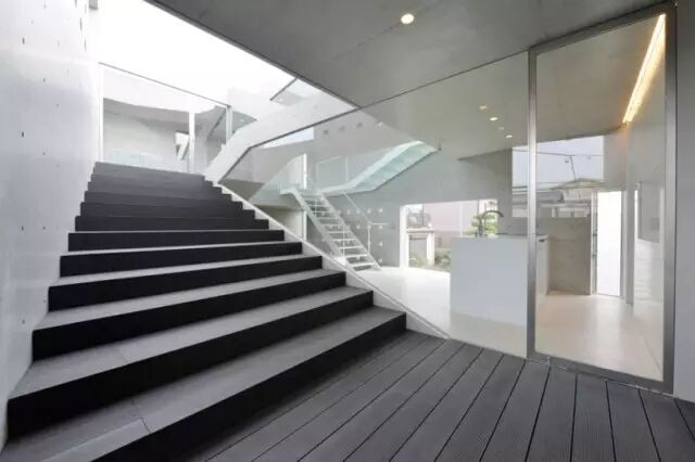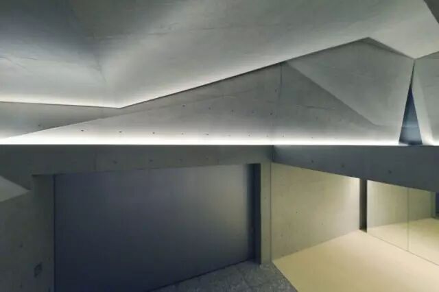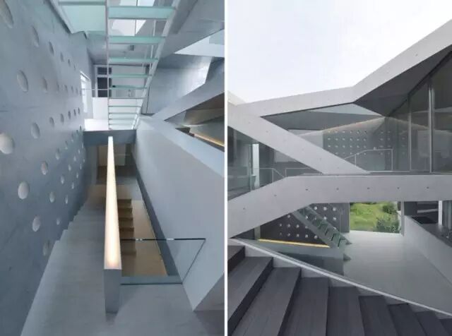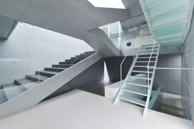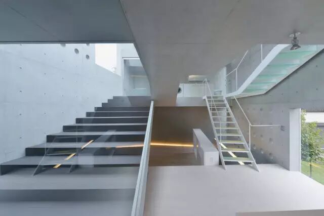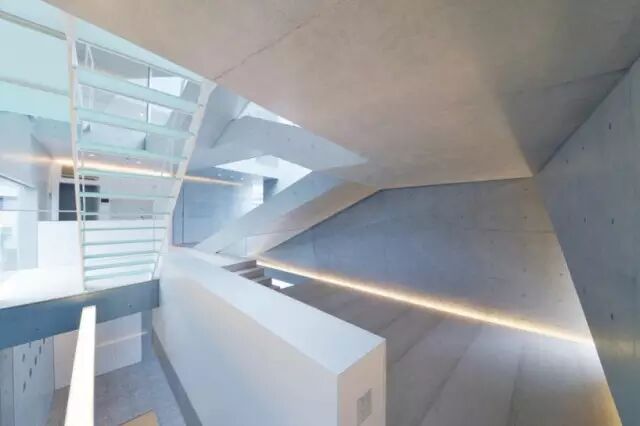 住宅位于一条繁忙的公路旁边,并处于住宅区开发用地的边缘 住宅内部由一系列连续空间串联起来,为住宅的拥有者提供舒展灵活的生活空间。住宅还有一个能隔离邻近街道噪音的封闭屋顶露台。为了满足客户的愿望,清水混凝土和玻璃的使用贯穿整个设计,使得整个方案给人以形态锐利、充满活力的感觉。该三层建筑的背后建筑由一体的外立面包裹起来住宅内部由一系列连续空间串联起来舒展灵活的生活空间设计大胆的楼梯连接着建筑的每一层清水混凝土和玻璃的使用使得整个方案给人以形态锐利、充满活力的感觉导向屋封闭顶露台的室外楼梯黄昏中的清水混凝土住宅